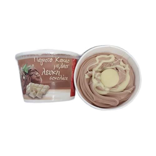 Παγωτό κύπελλο με γεύση κακάο, λιωμένη λευκή σοκολάτα και σοκολατάκι.